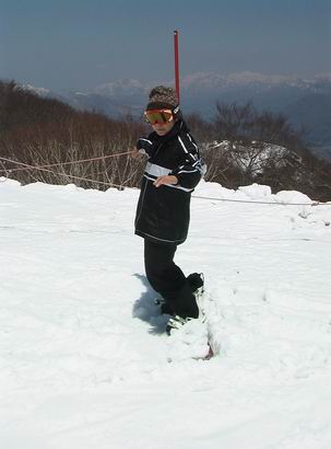 | 富士見パノラマスノーボードスクールではビギナーのレッスンの中で、片足での練習を積極的に取り入れています。 その中に「直滑降からのターン」があります。 これはターンの中の後半、山回りに相当します。 初心者がリフトから降りる時にも使えます。 練習場所は、片足装着なのでボードが滑ってくれるぎりぎりの緩斜面を選び恐怖心が最小になるようにします。 |