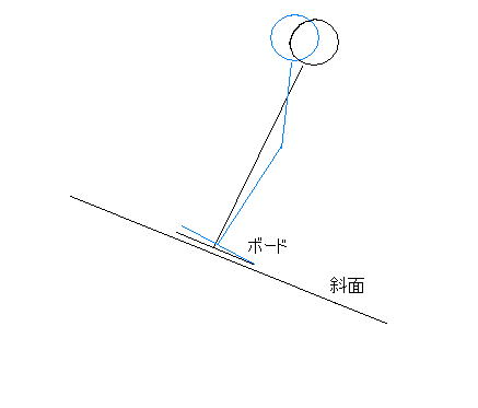 | 角付けってターンの3要素の一つで大事ですよね(角付け、ローテーション、荷重) 私がいつも思っていることを書きます ・角付けは内傾より先行する ボードの上に直立して滑る、つまり内傾角=角付けでは非常に不安定です。イントラの基礎練としてはOKですがそれ以外ではNGです。普通にはアンギュレーションを入れ内傾角よりも角付けを強くします。そうすればそこから角付けを強くも出来ますし、弱くしてもまだカービングできる余地が残っています。安定します これが最も重視されるのは切り替えの時だと思います 切り替えで、特にフロントターンへの時、頭から内傾していかない(内倒しない)と言う事は良く聞くと思います。頭の位置はボードの真上にあっても、腰がタ−ンの内側に入っていくとアンギュレーションにより角付けが生じます。内傾よりも角付けが先行すると言うことで、凄く重要な事だと思います。車用語で「シャーシーはエンジンよりも速く」とはメルセデスベンツのPR語で有名ですね。 「角付けは内傾よりも少し早く」を提唱したいです ![]() 斜面に直立しているだけの状態(黒線)とアンギュレーションを入れた状態(青線)です。共にボードと重心を結んだラインは斜面に垂直ですが、方や足裏は斜面にフラット、他方は角付けが生じている 角付けが生じていると言うことはターンに入らないと遠心力で外側に倒れることになります。現実にはアンギュレ−ションが入ると同時に内傾していくのだと思いますが、ほんの少しアンギュレ−ションが早い方が良いと思います。安心して谷側へ体を倒していけます 角付けは入れすぎるとブレーキに働くので注意! |