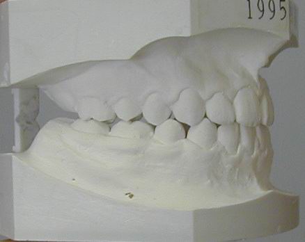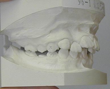 3歳ごろ治療をするか、永久歯の交換まで待つか、二通りの考え方があります。私は乳歯列の完成後、聞き分けができてくる3歳を目どに早期に治療した方が良いと考えています。反対咬合のまま永久歯の交換を待つと、顎の骨がそれに順応して、上顎は奥に引っ込んだ形、下顎は前に出た形になってしまいます。永久歯は乳歯の下から生える訳ですから、永久前歯も反対咬合の可能性が高くなります。 早期に反対咬合を改善しておけば、前歯が永久歯に変わる小学校2年生ごろまでの5年間ほどを、正常な噛み合わせで過ごせるので顎骨も正常に育ち、その場所に生える永久前歯も正常咬合が期待できます。 治療装置:ムーシールド(現在のメイン) チンキャップ ジャンピングプレート |