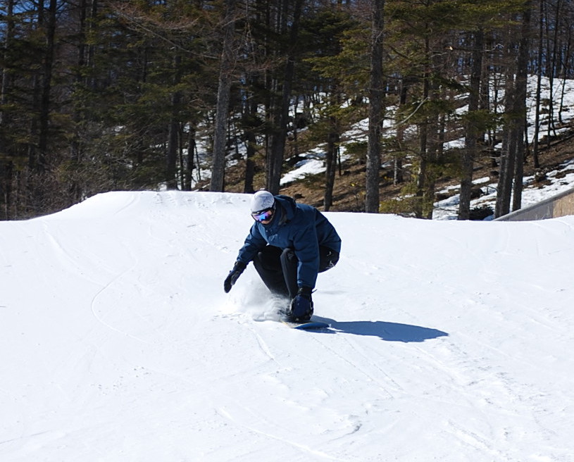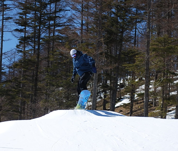 バッジテスト1級受験以上ではエアーが必須です 私もこの年になってエアーをしているとは思いませんでした。実はB級イントラ受験のシーズンまで1度もキッカーに入ったことがなかったのです(私の1級検定の頃はエアーは無かったのです) そこでエアー初心者の為のコツを掲載します。この順番でステップアップしていけば怖くなく上達する事請け合いです ステップ1:停止状態で フラット雪面で停止した状態で真上にジャンプ、着地が出来るか?離陸した場所に戻っているか? コツ:離陸と着地で足裏がフラット(角付けが起きない事)であるか?脚の曲げ(立ち上がり前と着地)伸ばし(離陸)でフロント、バックサイド方向のボードの角度が変わるのです。脚と腰の連動した曲げで足裏のフラットが崩れないように。(これは最後のステップまで最重要) 基本姿勢が崩れないこと。(特にローテーションが起きないようにする。ローテーションが起きると空中でボードが水平方向に回転を始める。 ジャンプする時に、両手orノーズ側の手を上に上げていき全身の伸展の誘導をする。脚部のみで行うより遥かにやり易い。 ステップ2:直滑降をしながら 緩斜面を直滑降しながらステップ1をする コツ:ズーとセンターに乗っている ステップ3:ただ抜ける 小さめのキッカーを選び中間姿勢でぬけるだけ コツ:ボード中央に重心を置きただ抜ける ステップ4:積極的に立ち上がる(小さく) ただ抜けるだけでは高さと距離が出ないので積極的に立ち上がります。ジャンプする必要はありません。(オーリーが出来なくてもまったくOK)最も大切なのはどこで立ち上がるか、タイミングです。リップです。 速度を調整し低い姿勢でアプローチし、キッカーのリップで垂線方向(アプローチ斜面に垂直方向では無い)に両手を万歳orノーズ側のてを上に上げながら立ち上がる コツ:立ち上がりをリップの真上で行う。一般的にはほとんどの人が早すぎる。高さが出ないときは立ち上がりのタイミングを遅くして行ってドンピシャリのタイミングを自分で探す。 ステップ5:積極的に立ち上がる(大きく) 進入スピードを上げ、深めに沈みこみ、早く、強く立ち上がる。 コツ:リップとのタイミングをとる(スピードが上がるとリップ通過もあっという間)。脚と腰の連動した曲げで足裏のフラットが崩れないようにする。垂線方向に立ち上がる ステップ6:トリック 高さと距離があれば、トリックをする時間的な余裕が生まれます。先ず高さと距離を出してから取り組んでください。オーリーを入れられればもっと高さが出ますが、B級イントラ検定の通過には出来なくても十分です 私が解説できるのはここまでです。なぜならグラブまでしか出来ないからです。 貴方の上達を祈っています |