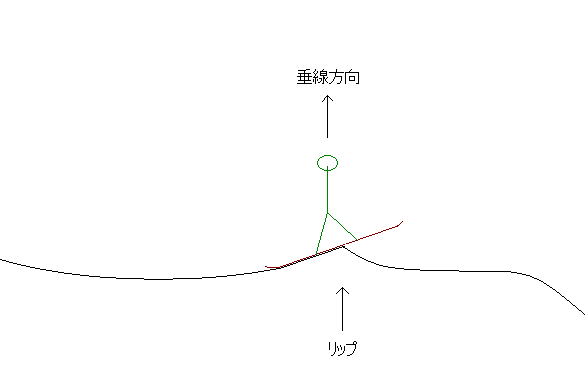 ![]() 前足はやや屈曲しています オーリーを意識する必要が無い理由は、上図のようにリップで垂線方向に立ち上がるだけで自然にオーリー状態になっていると考えるからです。次の写真参照 ![]() その他のコツ ・リップへのアプローチ リップを見ていく 脚、腰の屈伸をして重心中央、足裏フラットの確認をする スピードコントロール(自分のスピードで) ・リップから飛び出して空中へ 空中では飛び出しで伸ばした脚と上体、手を逆に小さくする。伸ばしたゴムが反動で小さくなるイメージ。小さくなると安定する。万歳した手をブーツに触りに行くのですが、意識としてはだらんと下げた手にブーツを引き上げ近づける、と考えた方がバランスを崩さないでしょう。うまくボードの反発を利用できると自然にボードが体に近づいて来るのでそのような感覚が実感できるとグラブは出来ます。自分から体を小さくしてもなかなか出来ないものです。 着地点を見ていく。 ![]() ・着地 空中で小さくなった脚を少し伸ばしランディングのショックに備える。 ![]() 着地で膝を曲げすぎないようにする。曲げすぎるとバックサイ ドに転びやすい 堀イントラ撮影の写真です。ありがとう・着地のボードの向きの修正 飛び出しの時ノーズがバックサイド方向に回転しやすいものです。慌てることは全くありません。上半身をボードが回ってしまった方向に大きく捻ると反作用でボードが修正されます。上体はあらぬ方向を向いていますがボードの方向、足裏のフラットが合っていれば何の問題も有りません |